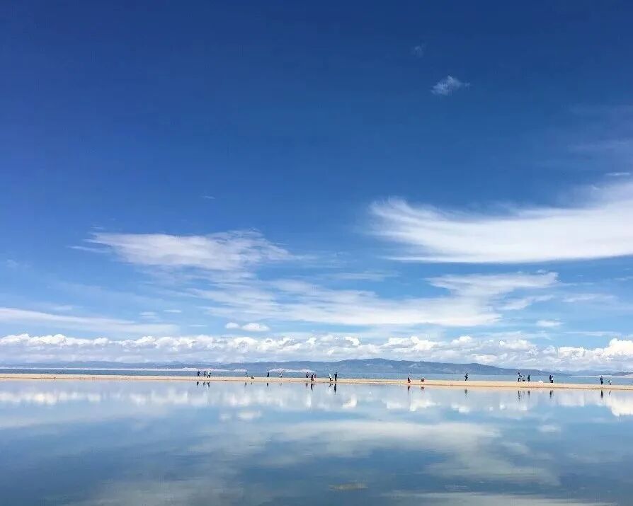 盐湖水域宽广 ,银波粼粼。天空白云悠悠,远处苍山峥嵘,蓝天白云、雪山映入湖中,如诗如画。
